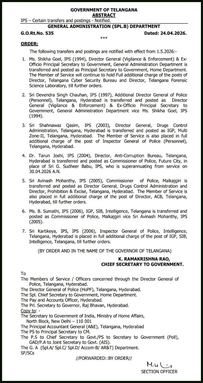 హోం శాఖ ప్రిన్సిపల్ సెక్రటరీగా శిఖా గోయల్ నియమితులయ్యారు. దీంతొ పాటు సైబర్ సెక్యూరిటీ బ్యూరో, ఫోరెన్సిక్ ల్యాబ్ అదనపు బాధ్యతలు కొనసాగుతాయి. విజిలెన్స్ & ఎన్ఫోర్స్మెంట్ డీజీగా దేవేంద్ర సింగ్ చౌహాన్ బదిలీ అయ్యారు. మల్టీ జోన్-2 ఐజీపీగా నియమితులైన షాహ్నవాజ్ ఖాసిమ్కు పర్సనల్ ఐజీపీ అదనపు బాధ్యతలు అప్పగించారు. సుధీర్ బాబు పదవీ విరమణ నేపథ్యంలో ఫ్యూచర్ సిటీ పోలీస్ కమిషనర్గా తరుణ్ జోషి నియమితులయ్యారు. అవినాష్ మహంతి డ్రగ్స్ కంట్రోల్ అడ్మినిస్ట్రేషన్ డీజీగా బదిలీ కాగా, ఏసీబీ డైరెక్టర్ అదనపు బాధ్యతలను నిర్వర్విస్తారు. కార్తికేయ ఐజీపీ ఇంటెలిజెన్స్కు అదనపు బాధ్యతలు అప్పగించారు. మల్కాజిగిరి పోలీస్ కమిషనర్గా, ప్రస్తుతం SIB (ఇంటెలిజెన్స్) IGPగా ఉన్న బి. సుమతి నియమితులు కావడం విశేషం.