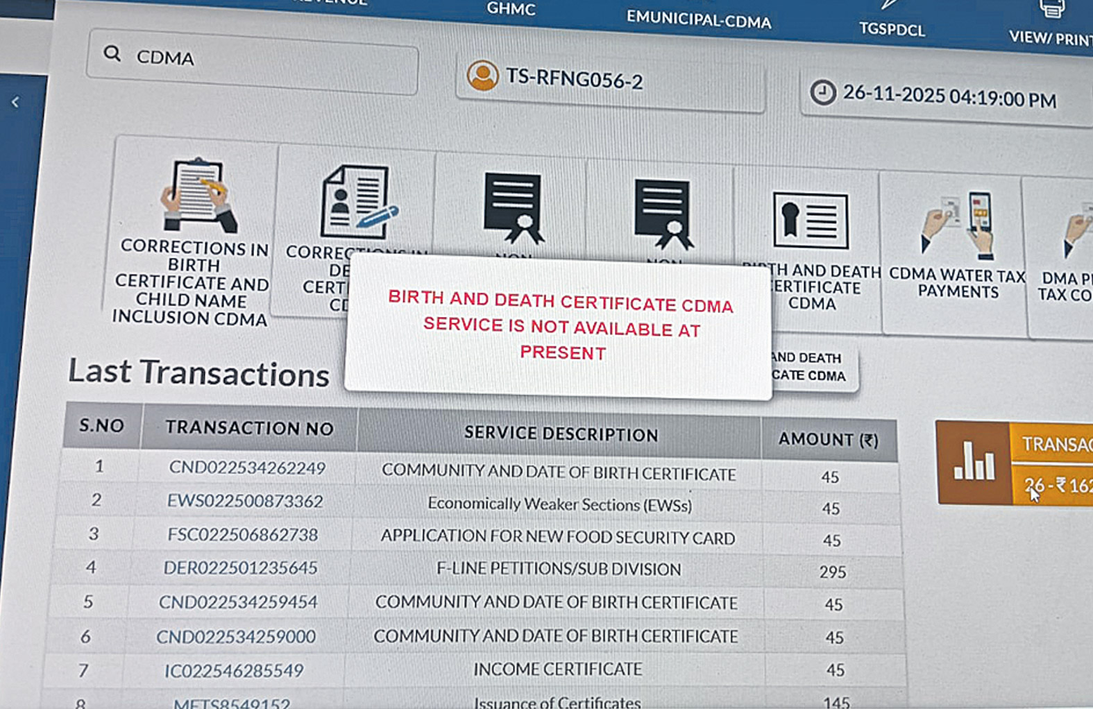 సాక్షి ప్రతినిధి, ఖమ్మం: వివిధ పనుల కోసం జనన, మరణ ధ్రువీకరణ పత్రాలు కావాలని పురపాలక సంఘాలు, కార్పొరేషన్లలో దరఖాస్తు చేసుకున్న వేలాదిమందికి ఆ పత్రాల జారీ స్తంభించింది. దరఖాస్తులను అధికారులు ధ్రువీకరిస్తే, మీ సేవ కేంద్రాలకు వెళ్లి సర్టిఫికెట్లు తీసుకోవాల్సి ఉండగా.. ‘ప్రస్తుతం జనన, మరణ ధ్రువీకరణకు సంబంధించిన సేవ అందుబాటులో లేదు..’(బర్త్ అండ్ డెత్ సర్టిఫికెట్ సీడీఎంఏ (కమిషనర్, డైరెక్టర్ మునిసిపల్ అడ్మినిస్ట్రేషన్) సర్వీస్ ఈజ్ నాట్ అవైలబుల్ ఎట్ ప్రజెంట్) అనే సమాధానం వస్తోంది. దాదాపు వారం రోజులుగా ఇదే పరిస్థితి ఉండటంతో దరఖాస్తు చేసుకున్న వారితో పాటు సర్టిఫికెట్ల కోసం దరఖాస్తుకు సిద్ధమైన వారిలోనూ ఆందోళన వ్యక్తమవుతోంది. ఆధార్ అప్డేట్, పేర్ల మార్పు, రిజి్రస్టేషన్లు, మ్యుటేషన్, లీగల్ ఎయిడ్, వీసాలు తదితర అవసరాలకు జనన, మరణ ధ్రువీకరణ పత్రాలు తప్పనిసరి. కొన్ని బ్యాంక్ లావాదేవీలకు కూడా చూపించాల్సి ఉంటుంది.