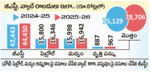 అంతకుముందు ఏడాది కంటే అన్ని రకాల పన్ను వసూళ్లలో 5 శాతం వృద్ధి నమోదైంది. 2024–25లో అన్ని రకాల పన్నులు కలిపి రూ.75,129 కోట్లు వచ్చాయి. కాగా, 2025 ఏప్రిల్ 1 నుంచి 2025 సెస్టెంబర్ 30 వరకు 1.2 శాతం ఎక్కువగా పన్ను వసూళ్లు రాగా, 2025 అక్టోబర్ 1 నుంచి 2026 మార్చి 31 వరకు 8.1 శాతం వృద్ధి నమోదైంది.