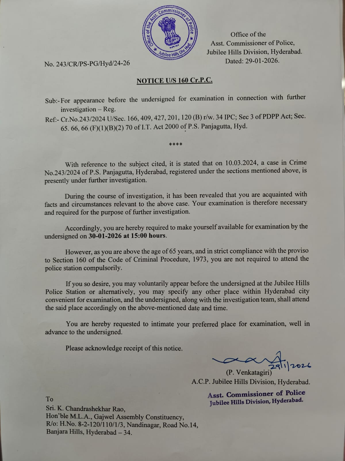 ఫోన్ ట్యాపింగ్ కేసులో కేసీఆర్కు సీఆర్పీసీ సెక్షన్ 160 ప్రకారం సిట్ నోటీసులు అందించింది. రేపు(శుక్రవారం, జనవరి 30న) కేసీఆర్ను సిట్ ప్రశ్నించనుంది. మధ్యాహ్నాం 3గం. విచారణ ఉంటుందని నోటీసుల్లో సిట్ పేర్కొంది. ఈ కేసులో ఇప్పటిదాకా నోటీసులు అందుకున్నవాళ్లు.. దర్యాప్తు కార్యాలయం జూబ్లీహిల్స్ పీఎస్లో అధికారుల ఎదుట విచారణకు హాజరైన సంగతి తెలిసిందే. అయితే.. వయసురిత్యా కేసీఆర్ విచారణలో వెసులుబాటు కల్పించింది.