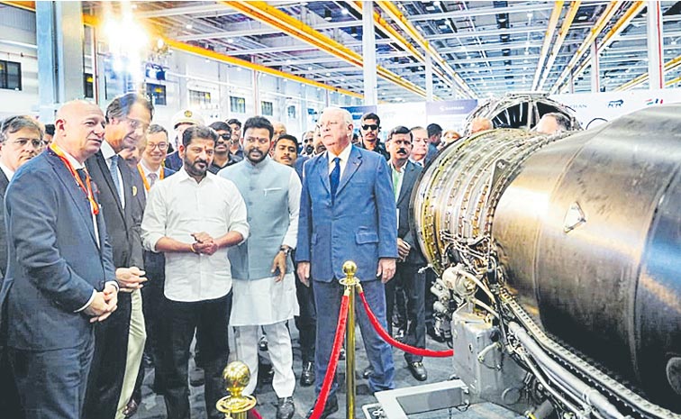సఫ్రాన్ సంస్థ ఏర్పాటు చేసిన విమాన ఇంజిన్ సర్వీస్ కేంద్రాన్ని పరిశీలిస్తున్న సీఎం రేవంత్రెడ్డి, చిత్రంలో కేంద్రమంత్రి రామ్మోహన్ నాయుడు, సంస్థ ప్రతినిధులు