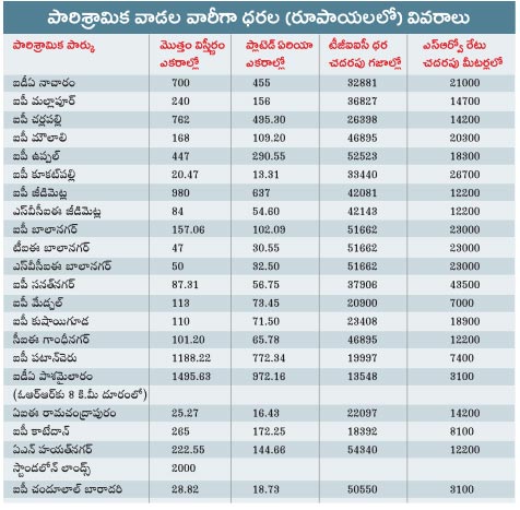 దీంతో వివిధ కారణాలతో కొంతకాలంగా పలు పరిశ్రమల్లో కార్యకలాపాలు నిలిచిపోయాయి. ఈ నేపథ్యంలోనే ఈ భూములను బహుళ వినియోగ (మల్టీ యూజ్) జోన్లుగా మార్చి అభివృద్ధి చేసేందుకు ప్రభుత్వం వెసులుబాటు కల్పిస్తున్నట్లు పరిశ్రమల శాఖ తన ఉత్తర్వుల్లో స్పష్టం చేసింది. ఈ మేరకు పారిశ్రామిక వాడల వారీగా కేటాయించిన భూ విస్తీర్ణం, ప్రస్తుతం మారి్పడికి అనువైన భూ విస్తీర్ణం, వాటికి టీజీఐఐసీ విలువను చదరపు గజాల్లో వెల్లడించగా.. సబ్ రిజిస్ట్రార్ ఆఫీసు (ఎస్ఆర్ఓ) విలువను చదరపు మీటర్లలో వెల్లడిస్తూ ఉత్తర్వులు వెలువరించారు.