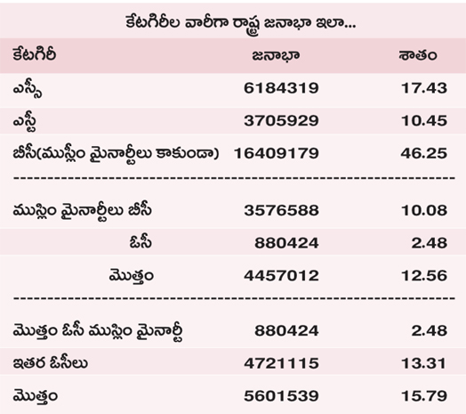 రాష్ట్ర మొత్తం జనాభా 3.54 కోట్లు ఉన్నట్లు సర్వలో వెల్లడైంది. ఇందులో బీసీ జనాభా 1.64 కోట్లు. వీరితో పాటు ముస్లిం మైనార్టీల్లోని బీసీలు 35.76 లక్షలు. రాష్ట్ర జనాభాలో బీసీల వాటా 46.25శాతం. ముస్లిం మైనార్టీల్లోని బీసీలను కలుపుకుంటే బీసీ జనాభా 56.33 శాతం. ఎస్సీ జనాభా 17.43శాతం, ఎస్టీ జనాభా 10.45 శాతం. రాష్ట్ర జనాభాలో ఓసీ జనాభా 15.79 శాతం ఉండగా... ఇందులో ముస్లిం మైనార్టీల్లోని ఓసీలు 2.48 శాతం. ఇతర ఓసీలు 13.31శాతం.