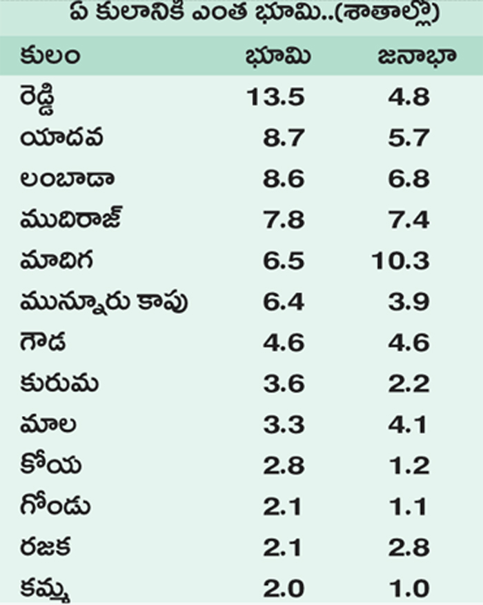 తెలంగాణలో ఆసాములు ఎవరో తేలిపోయింది. ఏ సామాజిక వర్గం చేతిలో ఎంత భూమి ఉన్నదన్న గణాంకాలను రాష్ట్ర ప్రభుత్వం బుధవారం విడుదల చేసిన సామాజిక ఆర్థిక సర్వే నివేదికలో వెల్లడించింది. ఈ గణాంకాల ప్రకారం చూస్తే మొత్తం ఆరు కులాల చేతిలోనే రాష్ట్రంలోని 50 శాతం భూమి ఉన్నట్టు అర్థమవుతోంది. ఇందులో రాష్ట్ర జనాభాలో 4.8 శాతం ఉన్న రెడ్డి సామాజిక వర్గానికి అత్యధికంగా 13.5 శాతం భూమి ఉంది. ఆ తర్వాత యాదవ,లంబాడా, ముదిరాజ్, మాదిగ, మున్నూరు కాపు సామాజిక వర్గాల చేతుల్లో ఎక్కువ భూమి ఉంది. ఇక రాష్ట్రంలోని మరో 31 కులాలకు కలిపి ఇంకో 30 శాతం భూమి ఉందని, ఇవికాక మిగిలిన అన్ని కులాలకు కలిపి మిగతా 20 శాతం భూమి ఉందని సర్వే గణాంకాలు వెల్లడిస్తున్నాయి.