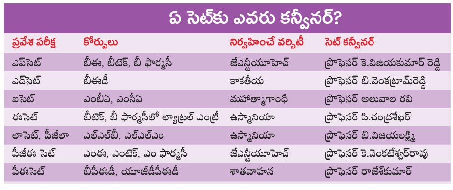 విజయకుమార్రెడ్డి జే ఎన్టీయూ మెకానికల్ విభాగంలో సీని యర్ ప్రొఫెసర్గా, జేఎన్టీయూ రెక్టార్ బాధ్యతల్లో ఉన్నారు. ఎప్సెట్తో పాటు మొత్తం ఏడు ప్రవేశ పరీ క్షల కన్వీనర్లను, ప్రవేశ పరీక్షలను నిర్వహించే వర్సి టీలను ఉన్నత విద్యామండలి చైర్మన్ ప్రొఫెసర్ బాలకిష్టారెడ్డి ఖరారు చేశారు. గత సంప్రదా యాలను పక్కనబెట్టి.. పాత వారితో పాటు కొత్త వారికి కన్వీనర్ బాధ్యతలప్పగించారు. ఎప్సెట్, పీఈసెట్, పీజీఈసెట్ కన్వీనర్లుగా కొత్త వారికి అవకాశమిచ్చారు. ఈసెట్, ఐసెట్, ఎడ్సెట్, లాసెట్ కన్వీనర్లుగా పాత వారికే అవకాశమిచ్చారు.