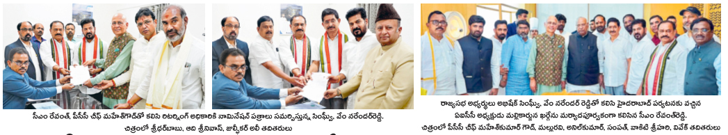 కాంగ్రెస్ పార్టీ తరఫున రాష్ట్రం నుంచి రాజ్యసభ అభ్యర్థులుగా ఎంపికైన అభిషేక్ మను సింఘ్వీ, వేం నరేందర్రెడ్డి ఉదయం 10:30 గంటలకు మంత్రులు, ఎమ్మెల్యేలతో కలిసి శాసనసభకు వచ్చి నామినేషన్లు దాఖలు చేశారు. మధ్యాహ్నం ఒంటిగంట ప్రాంతంలో ముఖ్యమంత్రి రేవంత్రెడ్డి అసెంబ్లీకి రాగా ఆయనతో కలిసి వెళ్లి మరో సెట్ నామినేషన్ పత్రాలను ఎన్నికల అధికారి ఉపేందర్రెడ్డికి అందజేశారు.