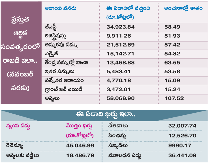 ఖర్చు అనివార్యం : కాగ్ లెక్కల ప్రకారం ఈ ఆర్థిక సంవత్సరం నవంబర్ వరకు ప్రతి నెలా సగటున ప్రభుత్వ ఖజానాకు రూ.19 వేల కోట్ల వరకు సమకూరుతోంది. ఇందులో రెవెన్యూ పద్దు కింద (ప్రభుత్వ నిర్వహణ) రూ.5,500 కోట్ల వరకు ఖర్చవుతుండగా, ఉద్యోగుల జీతాలు, పింఛన్ల కింద మరో రూ.5,500 కోట్లు అవసరమవుతున్నాయి.