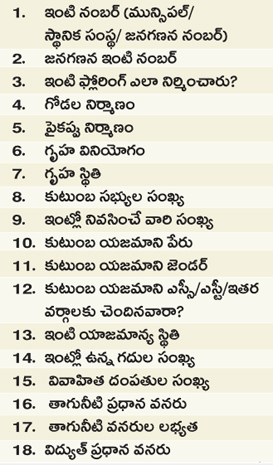 తొలి విడత జరిగే హౌస్ లిస్టింగ్ అండ్ హౌసింగ్ సెన్సెస్లో భాగంగా జనగణన సిబ్బంది ప్రతి ఇంటినీ సందర్శించి నిర్దేశించిన ఫార్మాట్కు అనుగుణంగా వివరాలను సేకరిస్తారు. తమ పరిధిలోని ప్రతి ఇంటి వద్ద మొత్తం 33 రకాల ప్రశ్నలు అడిగి సమాచారం సేకరించాలని కేంద్ర ప్రభుత్వం స్పష్టమైన ఆదేశాలు జారీ చేసింది. ఆయా వివరాలను పౌరులు తప్పనిసరిగా వెల్లడించాల్సి ఉంటుంది. కేంద్రంతో పాటు రాష్ట్రాలు అమలు చేసే కార్యక్రమాలన్నింటికీ జనగణన గణాంకాలే అత్యంత ప్రామాణికం.