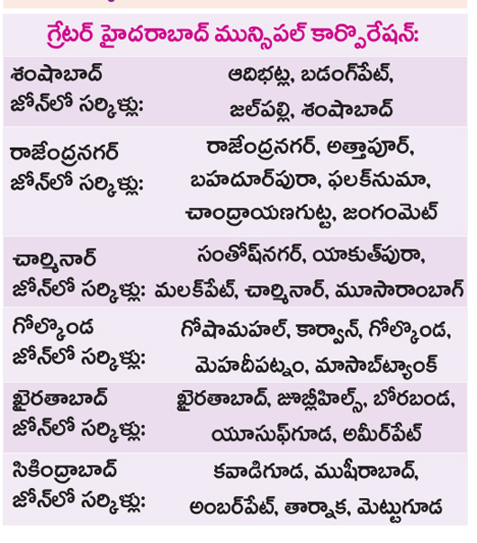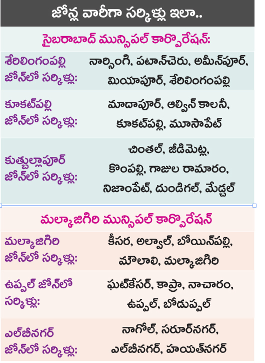 సైబరాబాద్ మున్సిపల్ కార్పొరేషన్: ఐటీ కారిడార్ను కలుపుతూ శేరిలింగంపల్లి, కూకట్పల్లి, కుత్బుల్లాపూర్ జోన్లు. మల్కాజిగిరి మున్సిపల్ కార్పొరేషన్: మల్కాజిగిరి, ఉప్పల్, ఎల్బీనగర్ జోన్లు గ్రేటర్ హైదరాబాద్ మున్సిపల్ కార్పొరేషన్: జీహెచ్ఎంసీ పేరును కొనసాగిస్తూ ..సైబరాబాద్, మల్కాజిగిరి కార్పొరేషన్లలో లేని మిగతా ఆరు జోన్లు (శంషాబాద్, రాజేంద్రనగర్, చారి్మనార్, గోల్కొండ, ఖైరతాబాద్, సికింద్రాబాద్).
