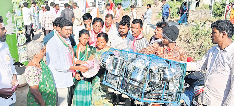 ఎన్నికల ప్రచారంలో భాగంగా గాజులయ్యతండాలో ఓ సర్పంచ్ అభ్యర్థి ప్రచారం నిర్వహిస్తుండగా గిన్నెల వ్యాపారి అటుగా వచ్చాడు. దీంతో వెంటనే సర్పంచ్ అభ్యర్థి ఒక్కొక్క మహిళకు గిన్నెలు ఇప్పించి.. ఓట్లు వేయాలని విన్నవించాడు.