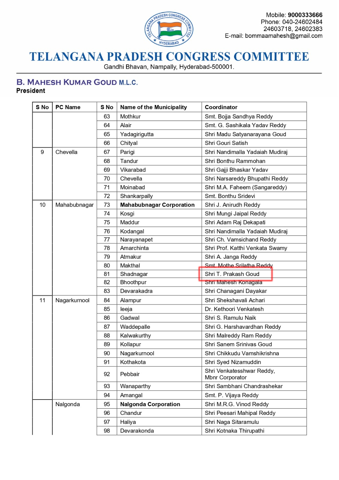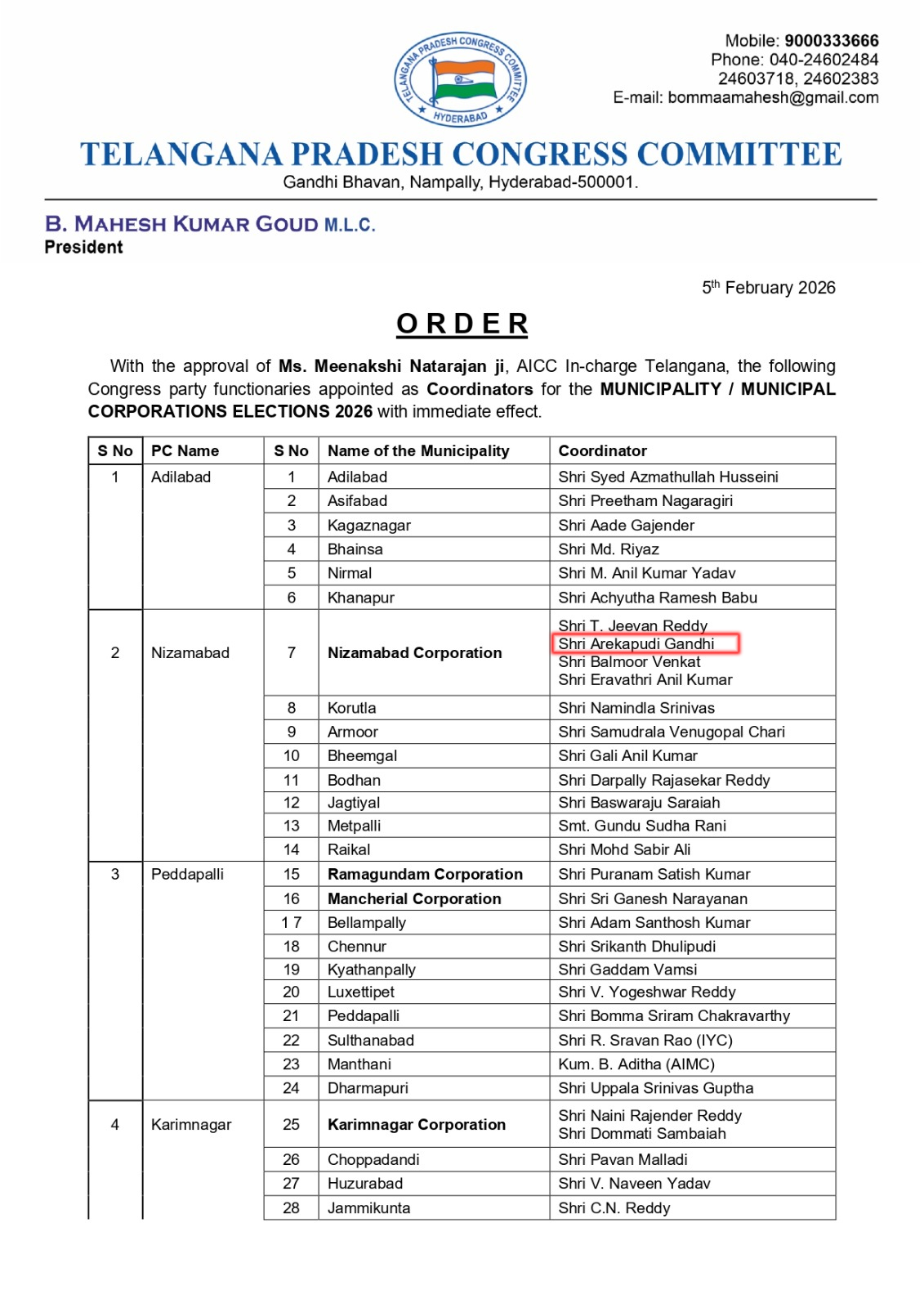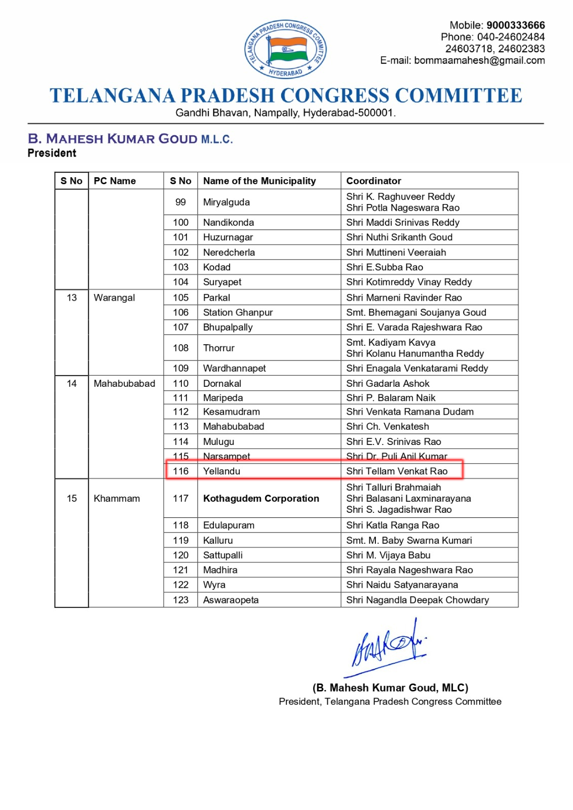 నిజామాబాద్ కార్పొరేషన్ కోఆర్డినేటర్ గా శేరిలింగంపల్లి ఎమ్మెల్యే ఆరికెపూడి గాంధీ, ఇల్లందు మున్సిపాలిటీకి భద్రాచలం ఎమ్మెల్యే తెల్లం వెంకట్రావు, షాద్ నగర్ మున్సిపాలిటీకి రాజేంద్రనగర్ ఎమ్మెల్యే ప్రకాష్ గౌడ్ పేర్లు టీపీసీసీ లిస్టులో దర్శనిమిచ్చాయి. పైన చెప్పుకున్న ముగ్గురికి అనర్హత వివాదంలో స్పీకర్ క్లీన్ చిట్ ఇవ్వడం తెలిసిందే.