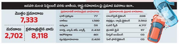 ఈ ఏడాది జనవరి నుంచి సెప్టెంబర్ వరకు తొమ్మిది నెలల వ్యవధిలో రాష్ట్ర వ్యాప్తంగా ఉన్న జాతీయ, రాష్ట్ర రహదారుల్లో 7,333 రోడ్డు ప్రమాదాలు జరగగా, 2,702 మంది ప్రాణాలు కోల్పోయారు. 8,118 మంది క్షతగాత్రులయ్యారు. రాష్టవ్యాప్తంగా 6,417 కిలోమీటర్ల పొడవున జాతీయ, రాష్ట్ర రహదారులు ఉన్నాయి. అయితే ప్రతీ కిలోమీటర్కు సగటున ఒక్కో రోడ్డు ప్రమాదం జరుగుతున్నట్టు రాష్ట్ర పోలీస్ శాఖలోని రోడ్డు భద్రతా విభాగ గణాంకాలు స్పష్టం చేస్తున్నాయి. జాతీయ రహదారులపై ఇరుకైన మలుపులు, ధ్వంసమైన రోడ్లు ఇలా ప్రమాదాలకు అనేక అంశాలు కారణమవుతున్నాయి.