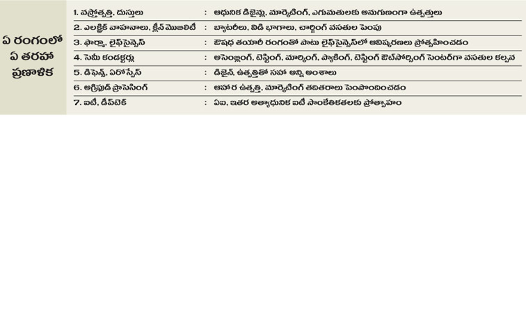 పరిశ్రమలు, తయారీ రంగం: ఔషధ, డిఫెన్స్, ఏరోస్పేస్ రంగాలు, ఎలక్ట్రానిక్స్, సెమీ కండక్టర్లు, అడ్వాన్సుడ్ మాన్యుఫ్యాక్చరింగ్, అగ్రి ఫుడ్ ప్రాసెసింగ్, ఎలక్ట్రిక్ వాహనాలు, క్లీన్ మొబిలిటీ, ఎంఎస్ఎంఈలు, టెక్స్టైల్, ఫ్యాషన్, గనులు, ఖనిజాలు