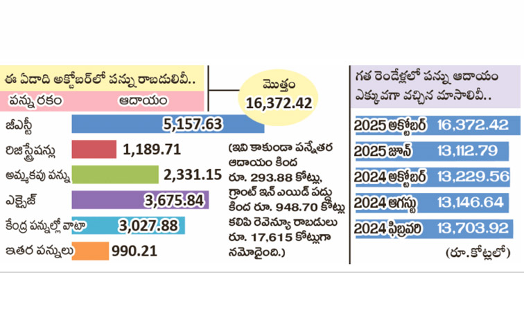 సాక్షి, హైదరాబాద్: పన్ను ఆదాయంలో ఈ ఏడాది అక్టోబర్ నెల రికార్డు సృష్టించింది. ఆ నెలలో ఏకంగా రూ. 16 వేల కోట్లకు పైగా పన్ను ఆదాయం ప్రభుత్వ ఖజానాకు సమకూరింది. కంప్ట్రోలర్ అండ్ ఆడిటర్ జనరల్ (కాగ్) 2025 అక్టోబర్కు విడుదల చేసిన గణాంకాల్లో ఈ మేరకు పేర్కొంది. ఇంత భారీ స్థాయిలో ఒకే నెలలో పన్ను ఆదాయం పెద్దఎత్తున రావడం ఇదే మొదటిసారి కావడం విశేషం. తెలంగాణ రాష్ట్రం ఏర్పాటైన తర్వాత గతంలో ఎప్పుడూ ఈ స్థాయిలో పన్ను ఆదాయం రాలేదని ఆర్థిక శాఖ వర్గాలు చెబుతున్నాయి. ఇందుకు రెండు ప్రధాన కారణాలున్నాయని అంటున్నాయి. ప్రతి నెలా రూ.1,000 కోట్లకు పైగా ఎక్సైజ్ ఆదాయం వస్తుండగా, ఈ అక్టోబర్లో ఏకంగా రూ.3,675 కోట్లు వచ్చింది.