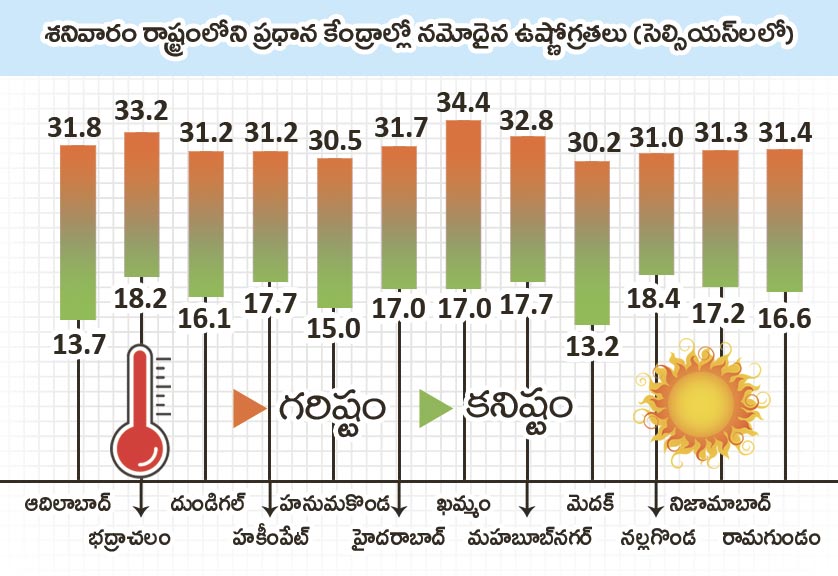 శనివారం రాష్ట్రంలోని ప్రధాన నగరాల్లో ఉష్ణోగ్రతలు పరిశీలిస్తే.. గరిష్ట ఉష్ణోగ్రత ఖమ్మంలో 34.4 డిగ్రీ సెల్సియస్, కనిష్ట ఉష్ణోగ్రత మెదక్లో 13.2 డిగ్రీ సెల్సియస్గా నమోదైంది. ఖమ్మంలో గరిష్ట ఉష్ణోగ్రత సాధారణంకంటే 3 డిగ్రీలు అధికంగా నమోదు కాగా.. హనుమకొండ, మెదక్, నిజామాబాద్ ప్రాంతాల్లో మాత్రం సాధారణం కంటే 2 డిగ్రీలు తక్కువగా ఉష్ణోగ్రతలు నమోదయ్యాయి. మిగిలిన ప్రాంతాల్లో మాత్రం సాధారణ స్థితిలోనే ఉన్నాయి. కనిష్ట ఉష్ణోగ్రతలు రాష్ట్రవ్యాప్తంగా సాధారణంకంటే 1 నుంచి 2.5 డిగ్రీ సెల్సియస్ తక్కువగా నమోదయ్యాయి.