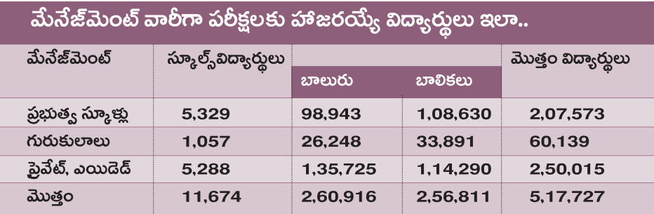 సాక్షి, హైదరాబాద్ : రాష్ట్రవ్యాప్తంగా ఈ నెల 14 నుంచి పదవ తరగతి పరీక్షలు మొదలవుతాయి. ఏప్రిల్ 16తో ఈ పరీక్షలు ముగుస్తాయి మొత్తంగా 5,28,239 మంది పరీక్షలకు హాజరవుతున్నారు. వీరిలో రెగ్యులర్ విద్యార్థులు 5,17,727 మంది. 5,329 ప్రభుత్వ పాఠశాలల నుంచి 2,07,573 మంది, 1,057 గురుకులాల నుంచి 60,139 మంది, 5,288 ప్రైవేట్, ఎయిడెడ్ స్కూల్స్ నుంచి 2,50,015 మంది పరీక్షలకు హాజరవుతున్నారు.