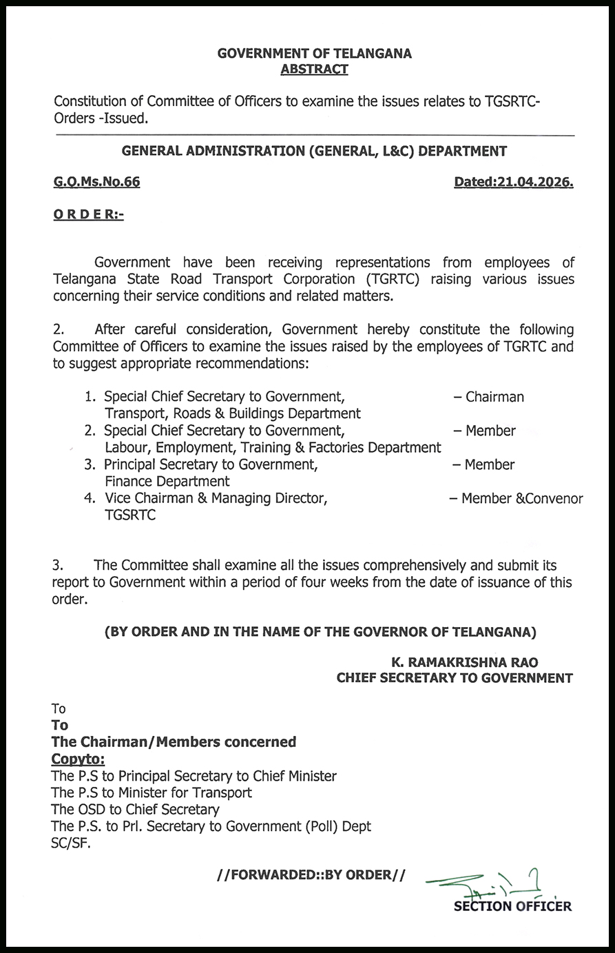 వినతులు క్షుణ్ణంగా పరిశీలించిన అనంతరం, టీజీఆర్టీసీ ఉద్యోగులు లేవనెత్తిన సమస్యలను పరిశీలించి, తగిన సిఫార్సులను సూచించడానికి ప్రభుత్వం ఈ క్రింది అధికారుల కమిటీని ఏర్పాటు చేస్తోంది..