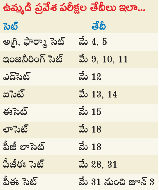 సాక్షి, హైదరాబాద్: ఇంజనీరింగ్, అగ్రికల్చర్, ఫార్మసీ కోర్సుల్లో ప్రవేశానికి ఉమ్మడి ప్రవేశ పరీక్ష (టీజీఈఏపీసెట్)ను 2026 మే 4 నుంచి నిర్వహిస్తారు. ఫార్మసీ, అగ్రికల్చర్ సెట్ను మే 4, 5 తేదీల్లో రెండు రోజులపాటు, ఇంజనీరింగ్ సెట్ను మే 9 నుంచి 11 వరకు మూడు రోజులపాటు నిర్వహిస్తారు. మిగతా సెట్స్ను కూడా మే నెలలోనే చేపడతారు. ఇందుకు సంబంధించిన తేదీలను ఉన్నత విద్యా మండలి చైర్మన్ ప్రొఫెసర్ వి.బాలకిష్టారెడ్డి మండలి కార్యదర్శి ప్రొఫెసర్ శ్రీరాం వెంకటేశ్తో కలిసి మంగళవారం విడుదల చేశారు. సెట్ కన్వీనర్లు, సెట్ నిర్వహించే యూనివర్సిటీలను సోమవారం వెల్లడించిన విషయం తెలిసిందే. ప్రవేశ పరీక్షల సమగ్ర సమాచారాన్ని త్వరలోనే సెట్ కన్వీనర్లు విడుదల చేస్తారని మండలి తెలిపింది.