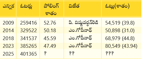 గత ఎన్నికల సరళి చూసినా 50 వేల ఓట్లు దాటిన అభ్యర్థులే గెలిచారు. నియోజకవర్గం ఏర్పడ్డాక తొలి ఎన్నికలో గెలిచిన కాంగ్రెస్ అభ్యర్థి విష్ణువర్ధన్రెడ్డికి దాదాపు 54 వేల ఓట్లు, మలి ఎన్నికలో గెలిచిన గోపీనాథ్కు దాదాపు 51 వేల ఓట్లే వచ్చాయి. ఆ తర్వాతి ఎన్నికల్లో ఓట్లు పెరిగే కొద్దీ మెజార్టీ పెరిగింది.