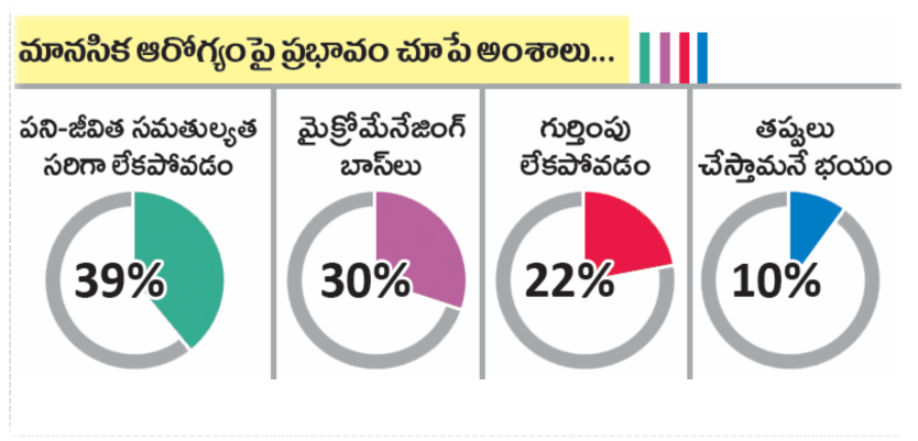 » మానసిక ఆరోగ్యం సరిగాలేని కారణంగా సెలవు తీసుకుంటే తమను అసమర్థులుగా చూస్తారని 31 శాతం మంది ఉద్యోగులు భయపడుతున్నారు