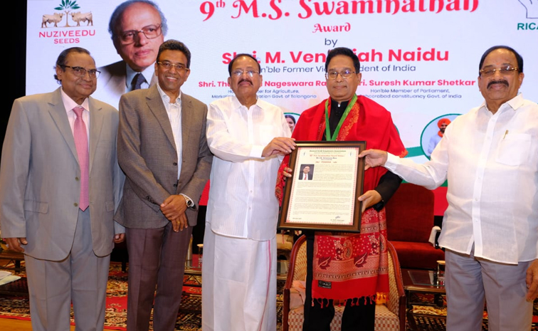హైదరాబాద్: హరిత విప్లవ పితామహుడు డాక్టర్ ఎం.ఎస్. స్వామినాథన్ పేరుతో ఏర్పాటు చేసిన ప్రతిభ పురస్కారాన్ని వ్యవసాయ రంగంలో విశేష సేవలందించిన ‘ఐసీఏఆర్–ఐఏఆర్ఐ ’ డైరెక్టర్, వైస్ ఛాన్స్లర్ డాక్టర్ సీహెచ్ శ్రీనివాసరావుకు అందజేయడం ఆనందంగా ఉందని భారత మాజీ ఉపరాష్ట్రపతి వెంకయ్య నాయుడు అన్నారు. రిటైర్డ్ ఐసీఏఆర్ ఉద్యోగుల సంఘం, నూజివీడు సీడ్స్ లిమిటెడ్ సంయుక్తంగా 2024–25 సంవత్సరానికి గాను ప్రతిష్ఠాత్మక 9వ ‘ప్రొఫెసర్ ఎం.ఎస్. స్వామినాథన్ అవార్డు’ పంపిణీ కార్యక్రమం శనివారం మర్రి చెన్నారెడ్డి మానవ వనరుల అభివృద్ధి సంస్థ (ఎంసీఆర్హెచ్ఆర్డీ) ఇనిస్టిట్యూట్లో ఏర్పాటు చేశారు.